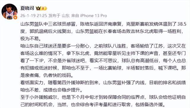在山东队客场击败了吉林队之后,夏晓司老师就在社交平台公开发声,他表示,“山东男篮队中三名球员感冒,陈培东返回济南康复,克里斯赛前发烧体温到了38.5度,郭凯退烧后火线复出,山东男篮能在长春客场击败吉林东北虎取得一场胜利,极为不易。”