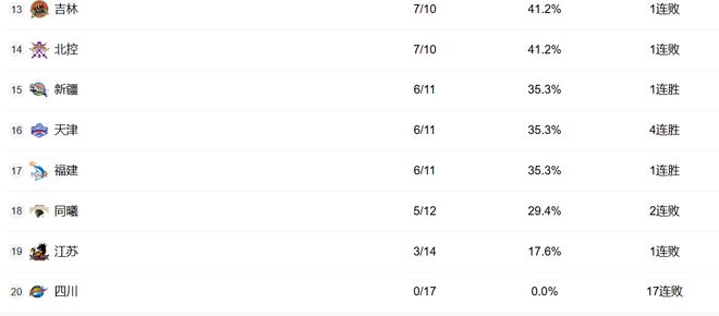江苏最近崛起,但这轮输球之后停滞。四川已经17连败了。