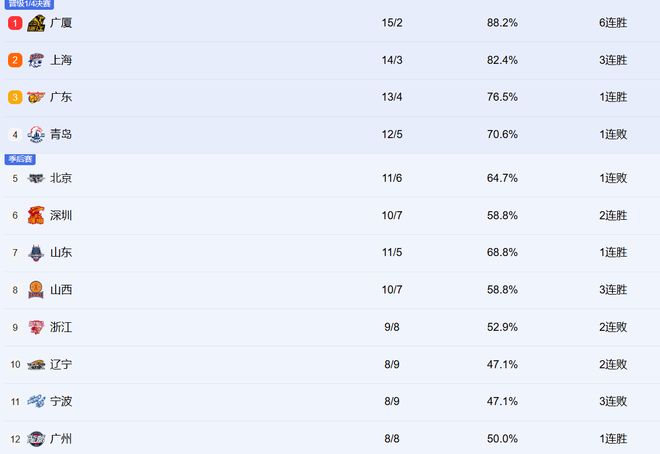 浙江、辽宁、宁波和广州排在9-12。浙江已经两连败了,相比于之前的强势崛起,最近有点放缓了。辽宁也是两连败,他们的核心问题还是出在得分点太少了,即便赵继伟复出也无法盘活全队。宁波则遭遇三连败,国内球员得分能力太差了。广州则在保持紧咬,这轮还大胜了北控。