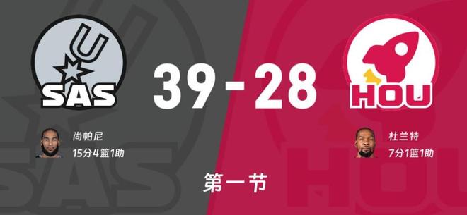 热身阶段火箭主场篮筐歪了耽误了半小时,文班亚马跳得首次进攻球权,文班直接对位申京,阿门对位福克斯,杜兰特对位巴恩斯!卡斯尔三分不中,奥科吉失误,巴恩斯翻身跳投不中,阿门空接暴扣,巴恩斯三分回应3-2开局!申京怼翻文班上篮得手,尚帕尼三分有了,奥科吉前场篮板2+1加罚不中,申京内线又打成文班一球,卡斯尔三分再中马刺开场三分不错,回过来史密斯外线也能回应,文班自投自抢造成杜兰特犯规,两罚全中比分11平!中段场面依旧胶灼,火箭这边自己进攻打得不错,但是完全防不住马刺三分,6分20秒马刺已经投中4个三分,奥科吉点起卡斯尔造成犯规进入官方暂停。回来两罚不中,尚帕尼外线三分还有19-15外线放太空了,好在杜兰特外线能回应上,尚帕尼外线造成犯规三罚全中+三分27-22领先,节末福克斯爆发带队打了一波12-6,首节火箭28-39落后!