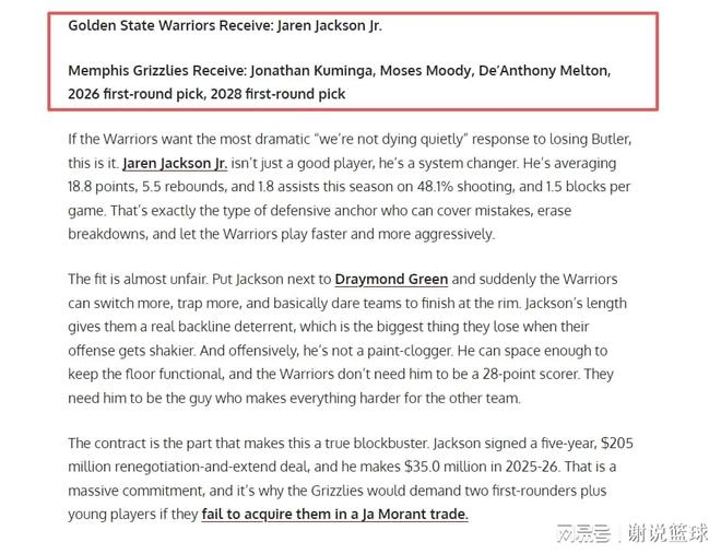 美媒支招勇士做5换1交易,可追19+6内线,出三替补+两首轮签?