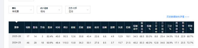 另外,上海男篮上赛季常规赛的百回合失分、得分、净胜分均是联盟第六水平。本赛季17轮后,他们的百回合失分、净胜分已高于联盟第一,百回合得分排在联赛第三。