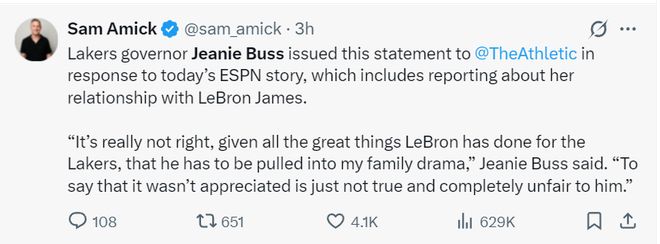 随后珍妮-巴斯委托TA记者萨姆-阿米克对ESPN的长文辟谣:鉴于LBJ为湖人所做的一切,他被卷入了我的家族纷争这太离谱了。ESPN的报道并不真实,对LBJ来说也太不公平。