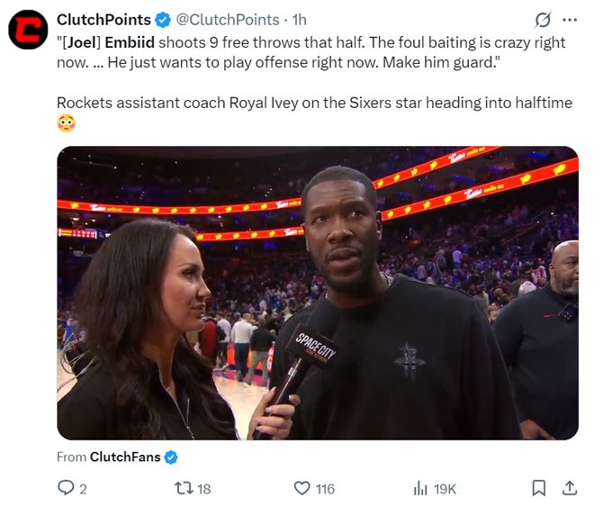不过这场比赛恩比德依旧被吐槽了,在第二节恩比德单节9个罚球,火箭助理教练罗亚尔-艾维说道:短短几分钟就获得了9个罚球这太疯狂了,他就是故意去碰瓷的。