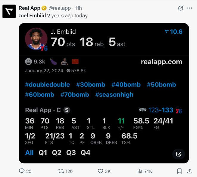 实际上在两年前的今天,恩比德单场36分钟拿到70分18篮板5助攻1抢断1盖帽帮助费城击败马刺,两年过去了恩比德终于再度回到巅峰?
