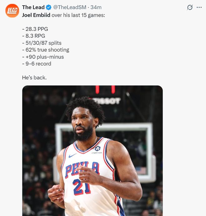 过去的15场比赛,恩比德场均28.3分8.3篮板,命中率51%,三分命中率30%,罚球命中率87%,真实命中率62%,正负值+90,战绩是9胜6负,美媒评价他重返巅峰了。