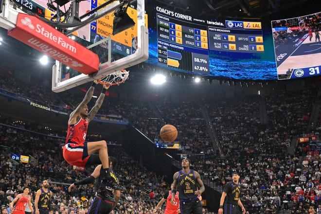下半场易边再战,第三节上来哈登先突破2+1,小卡无差别单打连砍5分,快船一波8-2直接打花。湖人暂停。不过暂停也没什么用,小卡回来中投+三罚,继续扩大领先优势。湖人回敬一波小高潮追到只差19分,大洛三分止血,但湖人反击高潮还在继续,一波14-3迫近。米勒造犯规罚球以后,东契奇三分还有。老詹抢断扣篮以后,三节结束湖人72-86落后14分。