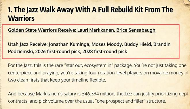 美媒《Fadeaway World》便撰文提出了一套交易方案,建议勇士将库明加、穆迪、希尔德、波杰姆斯基以及2026年、2028年的首轮签送到爵士,换回全明星前锋。