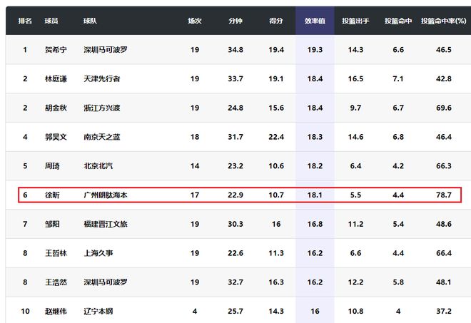 徐昕的效率值达到了18.1,在国内本土球员中排名第六,在他前面的是贺希宁、胡金秋、林庭谦、郭昊文和周琦。徐昕的投篮命中率在本赛季场均得到4分以上的球员中排名第一。徐昕场均得到7.3个篮板,在本赛季本土球员中排名第二,仅次于场均得到9.1个篮板的周琦。