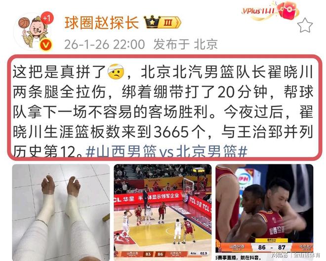 此役,翟晓川双腿缠满了绷带,咬牙打了20分钟,投篮7中3,罚球4中3得到9分4篮板4助攻。翟晓川的带伤复出,缓解了球队锋线无人可用的压力。9分4篮板4助攻,尽管数据算不上抢眼,但对于拖着两条伤腿的翟晓川来讲,他已经是竭尽所能了……
