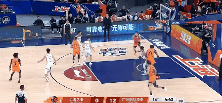 开场后,广州男篮反客为主,连续命中3记3分,而上海男篮这套首发阵容一分未得,以0比12落后。