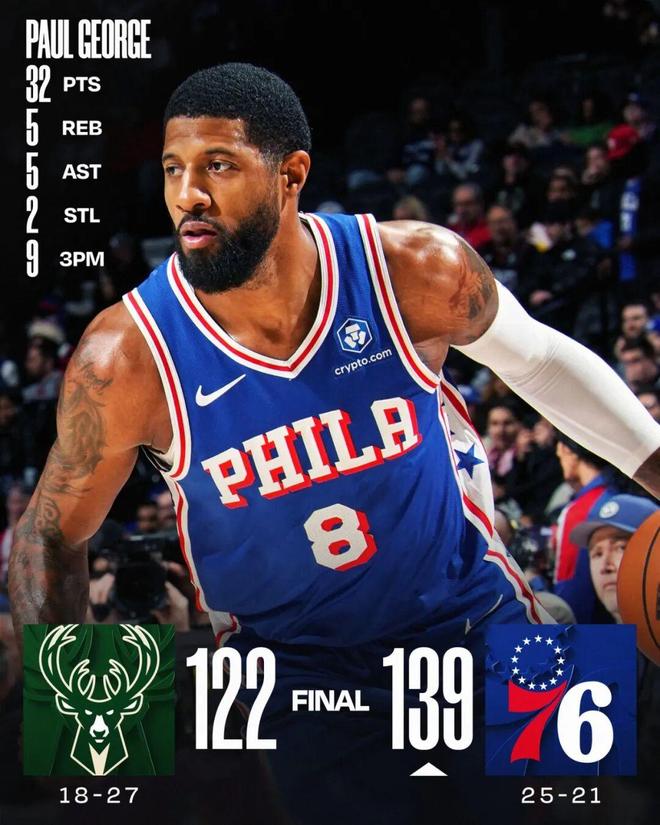 常规赛,76人主场139-122战胜雄鹿。