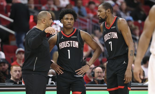 火箭队这场失利的主要原因在哪?谁是输球的罪臣呢?个人认为今天比赛,仅有1个人的表现可以全身而退,另外有两人必须要为失利负责。首先来看全身而退的球员,那就是杜兰特。今天杜兰特出战37分钟,17中8砍下24分2板6助,他是今天火箭上半场开局不错的关键因素,已经表现的非常好了。末节比赛没有站出来也情有可原,一是因为末节比赛火箭还是没有进攻战术,就知道让阿门去打,球都到不了他那。二是作为一个37岁的老将,乌度卡这么用,怎么一直保持高效?