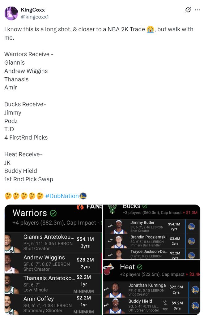 有一位勇士球迷模拟了一套三方大交易方案,这笔交易方案涉及9人,这样勇士可以一步到位同时得到威金斯、扬尼斯。