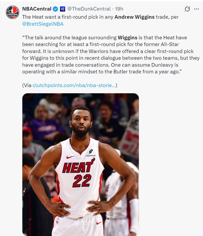 北京时间1月29日,根据美记Brett Siegel的报道,热火对威金斯的要价是一个首轮签,目前尚不清楚勇士队与热火队谈判时是否愿意送出一个首轮签,热火的诉求就是送出这位全明星的前锋至少得出一个首轮签。邓利维的交易思路跟去年换巴特勒的类似。