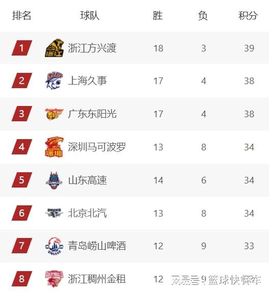 附:CBA积分榜最新排名