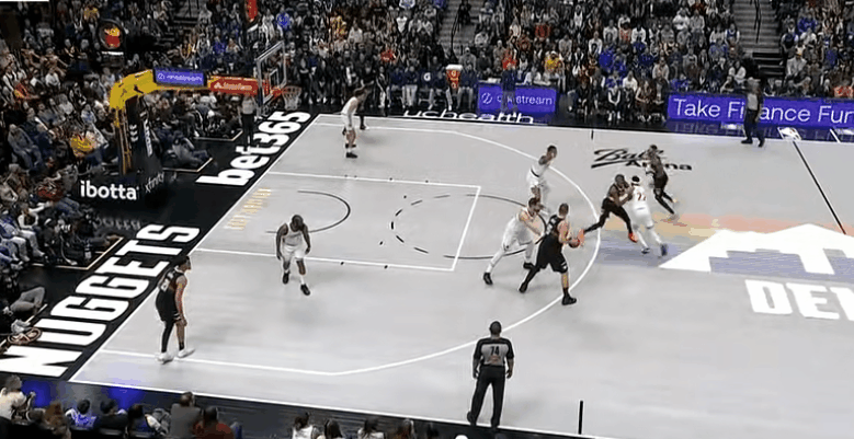 莱纳德能强拆,但面对夹击,花了许久才发现掘金锁他左路撤步,于是从右路冲。