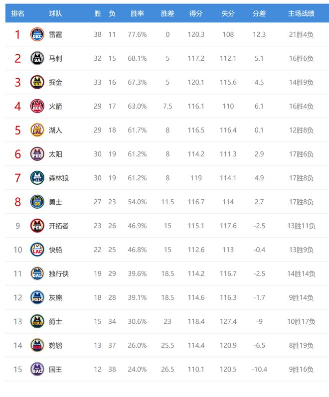 今日比赛后湖人、森林狼、太阳排名互换,灰熊、独行侠排名互换,国王、鹈鹕排名互换,总计7支球队排名互换。