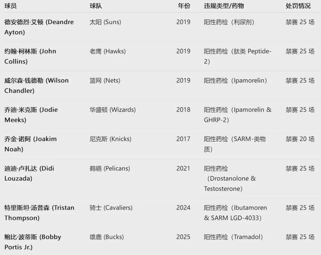 违反联盟禁药条例的处罚比较重,一般要禁赛20场以上。2025年2月21日,雄鹿内线波蒂斯被禁赛25场。再往前看,2024年1月24日,特里斯坦-汤普森被禁赛25场。光是2019年,艾顿、约翰-科林斯、威尔森-钱德勒等全被禁赛25场。