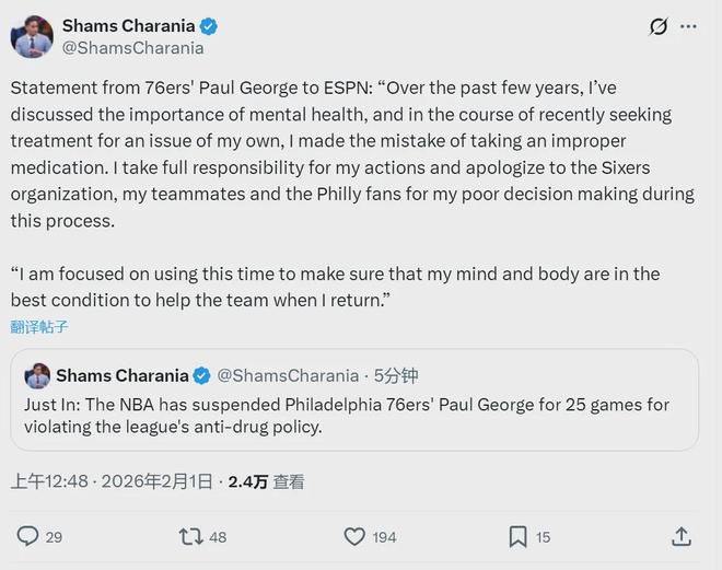 北京时间2月1日凌晨,一则突发消息,据NBA名记Shams报道,76人球星保罗-乔治因违反联盟禁药政策,被NBA禁赛25场。之后乔治通过ESPN发布道歉声明,乔治表示,自己是为了治疗心理健康,错误地服用了联盟违规的药物。