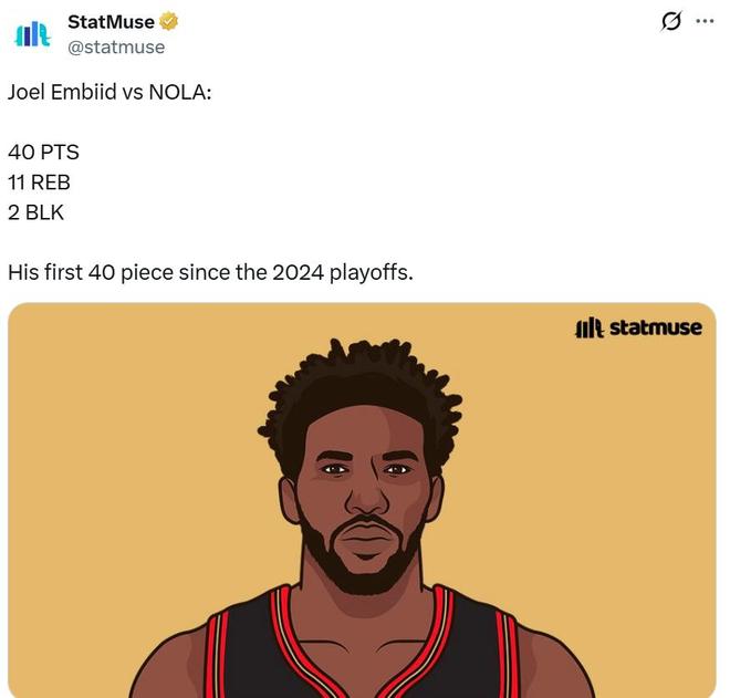 用梦回巅峰来评价本场恩比德的表现一点也不为过,因为他上一次单场轰下40分还要追溯到24年没有反复遭遇膝盖大伤时。