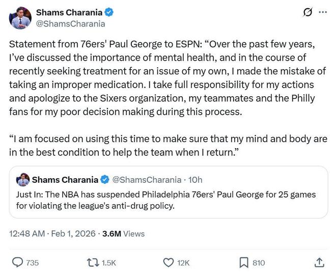 随后NBA官方发布公告确认消息真实性,乔治本人也发布声明表示自己是在寻求治疗自身心理健康问题的过程中,错误地服用了不合适的药物。
