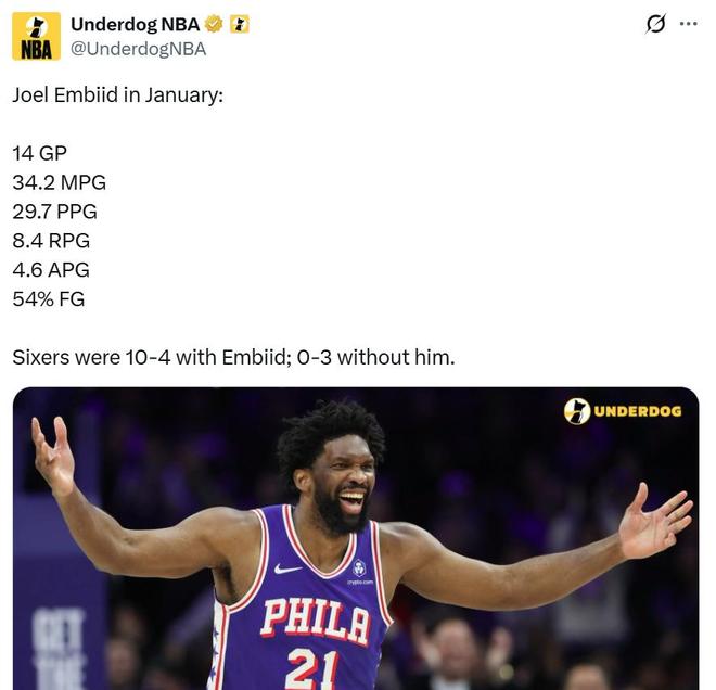 值得一提的是,恩比德本场的表现并非灵光一闪,而是1月份以来火爆表现的缩影。