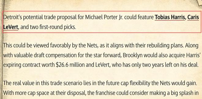 消息人士透露,活塞内部已经给出了一份可能会打动篮网的报价——哈里斯、勒韦尔以及2个首轮签。