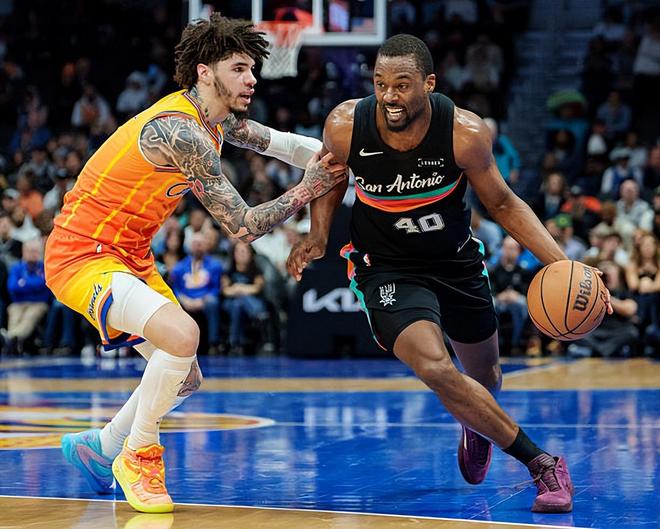 本场比赛中,马刺的替补锋线球员哈里森-巴恩斯(Harrison Barnes)的表现也算是有所回暖了。巴恩斯全场出场24分48秒,投篮6中3,三分线外5中3,罚球2中2,得到了11分3篮板2助攻的数据,还有1次失误和2次犯规,正负值为+4。巴恩斯在进攻端没有得到什么出手机会,但是他的进攻效率其实还算不错,也是得到了一定的分数,算是起到了一定的作用了,而且他看起来还是具备一定的传球能力和策应能力的。巴恩斯在其他方面的表现比较一般,但是好歹也没有给球队造成什么太大的问题,在防守端也算是能够起到一定的作用的。作为一名出场时间不多的替补球员,能够打出这样的表现,也算是合格了。