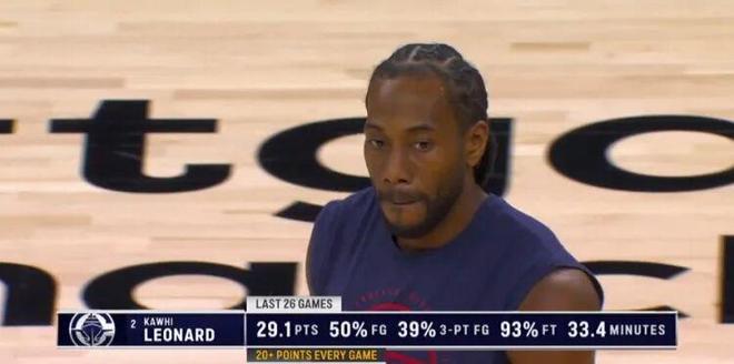 过去26场,伦纳德全部得分20+,场均29.1分,命中率50/39/93%