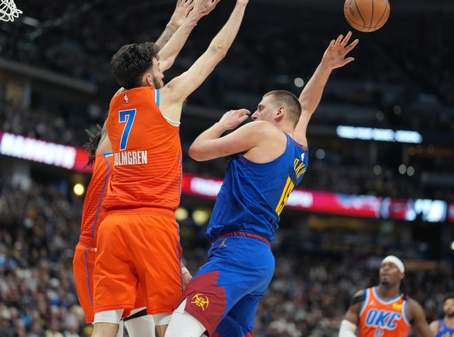 第三节掘金更是兵败如山倒,就连卡森-华莱士这个身高只有1.91米的小后卫都开始碾碎掘金防线,他单节三分6中4拿到12分,亚历山大单节7中4+三分1中1拿到12分5助攻,这两人就将分差拉开,SGA三节已经27分12助攻连续120场比赛拿到20+,而约基奇三节只有14分7助攻而已。
