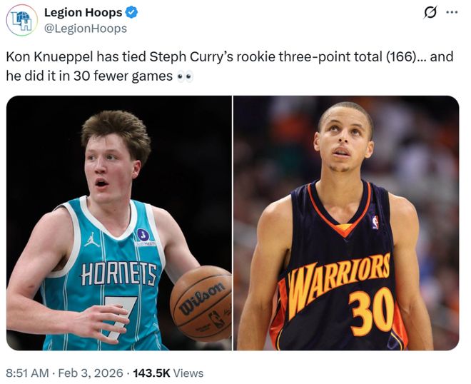 他仅花费50场比赛就已经命中166记三分,而库里新秀赛季出战80场才达到这一数字,要知道黄蜂队本赛季还有31场常规赛要打,克努佩尔势必要大幅提升这一纪录。