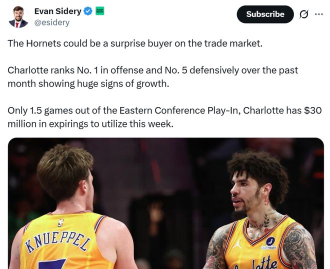 在豪取7连胜强势北伐的同时,黄蜂队还手握3000万到期合同,美记Evan Sidery曝他们将成为交易截止日前的黑马之一。