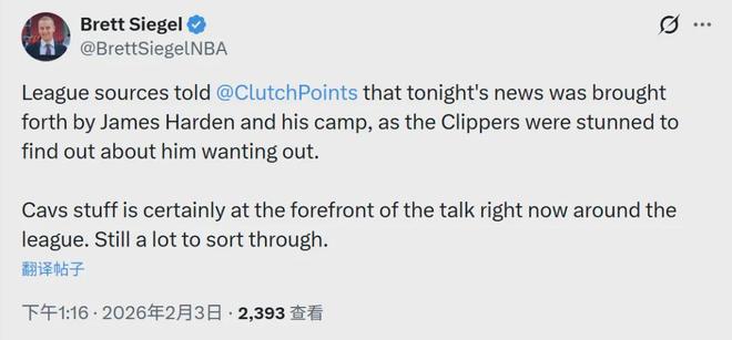 名记Siegel对此表示,是哈登主动申请交易,快船虽然很震惊但也同意了。