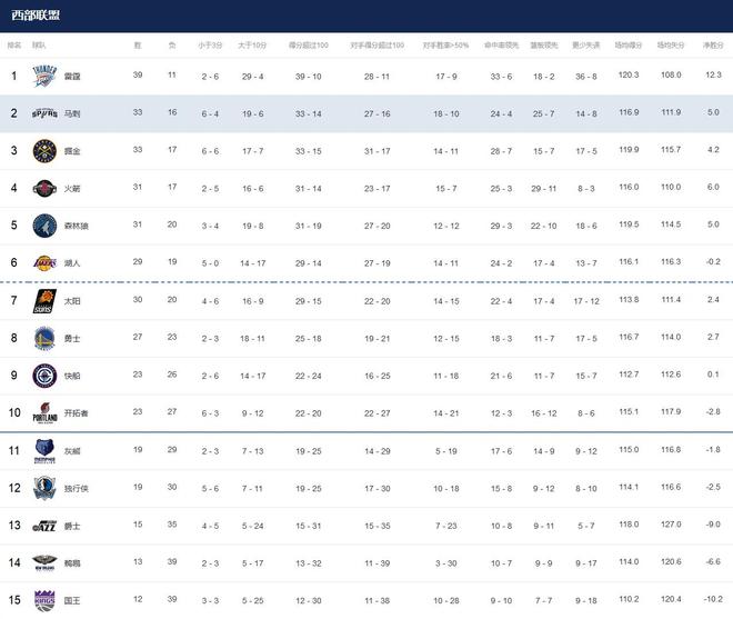1-5名:活塞(1)、雷霆(2)、马刺(4)、火箭(3)、掘金(5)!