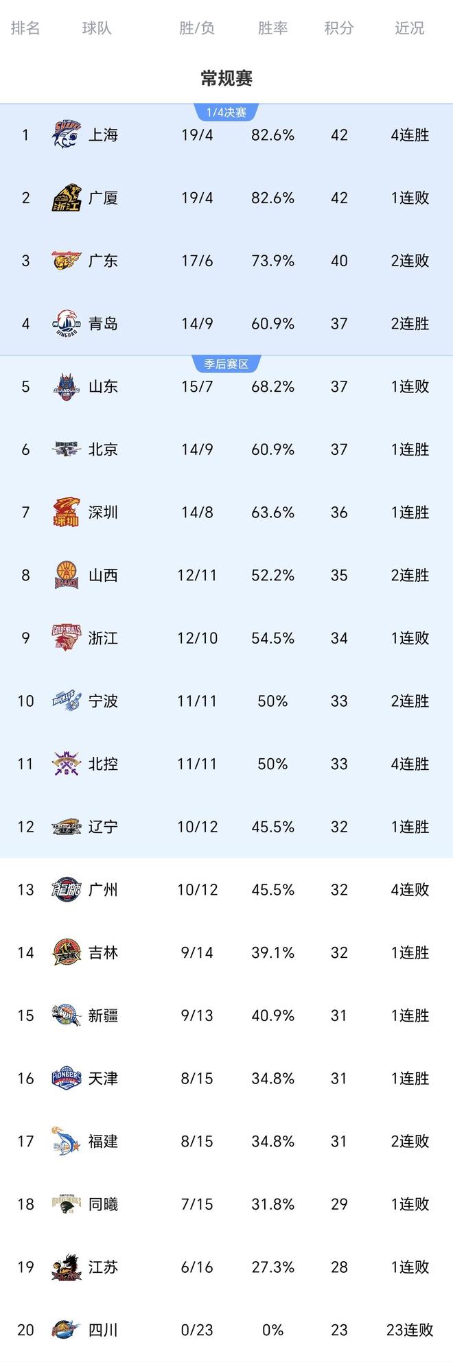 常规赛第一阶段结束之后的最新积分榜排名: