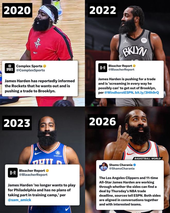 但现实往往事与愿违——哈登每加入一支新球队后没多久,“想走人”的戏码就会上演。