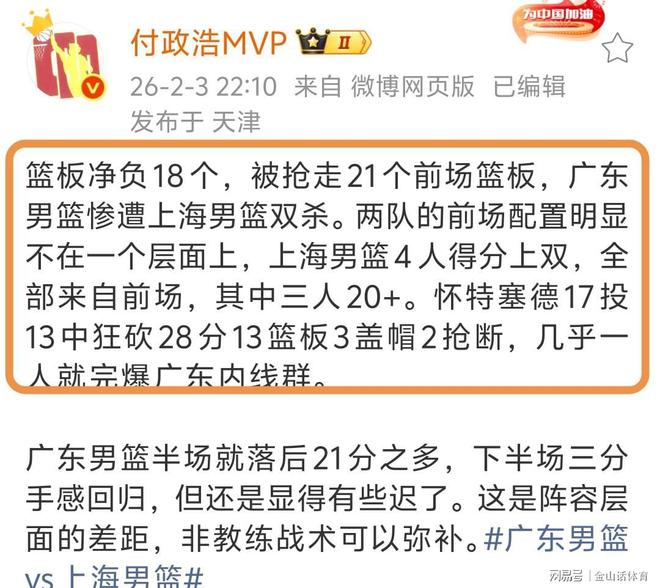 赛后,媒体人付政浩MVP社媒发文表示:篮板净负18个,被抢走21个前场篮板,广东男篮惨遭上海男篮双杀。两队的前场配置明显不在一个层面上,上海男篮4人得分上双,全部来自前场,其中三人20+,怀特塞德28分15篮板3盖帽2抢断,几乎一人就完爆广东内线群……