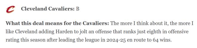 正如名记Shams所说:“对于骑士队来说,引进哈登这样一名75大巨星显然能够提高球队上限,他与米切尔的联手将让球队有资格在东部竞争冠军。”