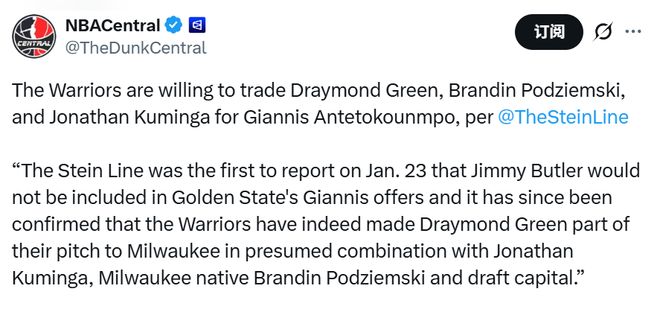 Stein表示:“1月23日我们已率先报道,吉米-巴特勒不会被纳入勇士队追逐字母哥的交易报价中。此后消息得到证实,勇士队为说服雄鹿交易,已明确将德雷蒙德-格林纳入交易方案,这份报价大概率还包含乔纳森-库明加、土生土长的威斯康星州密尔沃基人波杰姆斯基,以及若干选秀资产。”