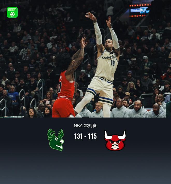 第四节雄鹿库兹马拿下6分,公牛帕特里克-威廉姆斯拿下9分,最终雄鹿131-115战胜公牛