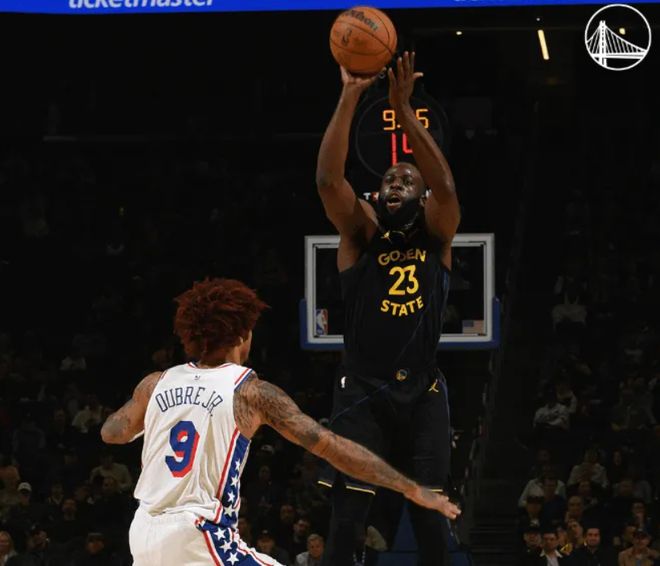 首节比赛,勇士火力全开,全队三分合计14中8、命中率高达57%;76人三分10中3、命中率仅30%。