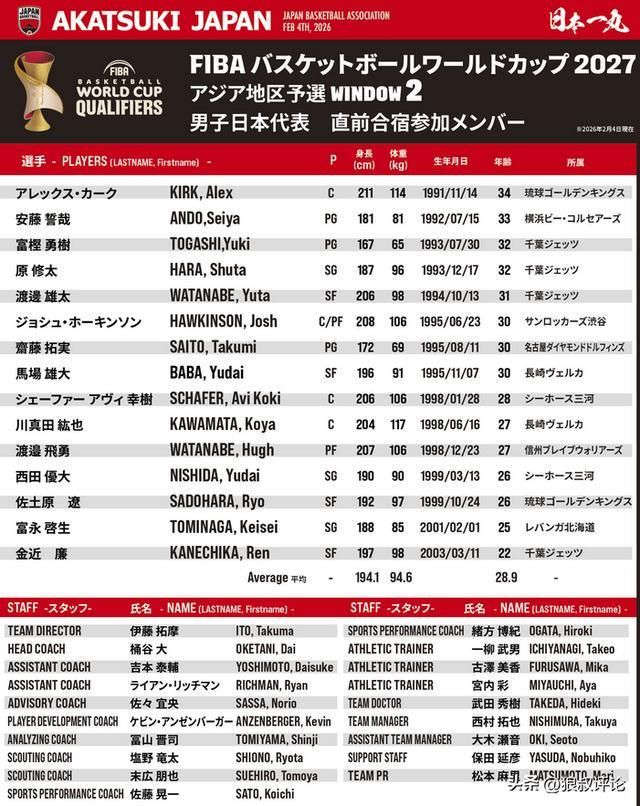 另外值得一注意的是日本男篮平均身高只有1米94,平均年龄达到了28.9岁,大部分都是已经进入到成熟阶段的运动员为主,从集训时间可以看到大幅度减少,2月17日集结后,2月26日就主场迎战中国男篮,仅仅一周多时间。