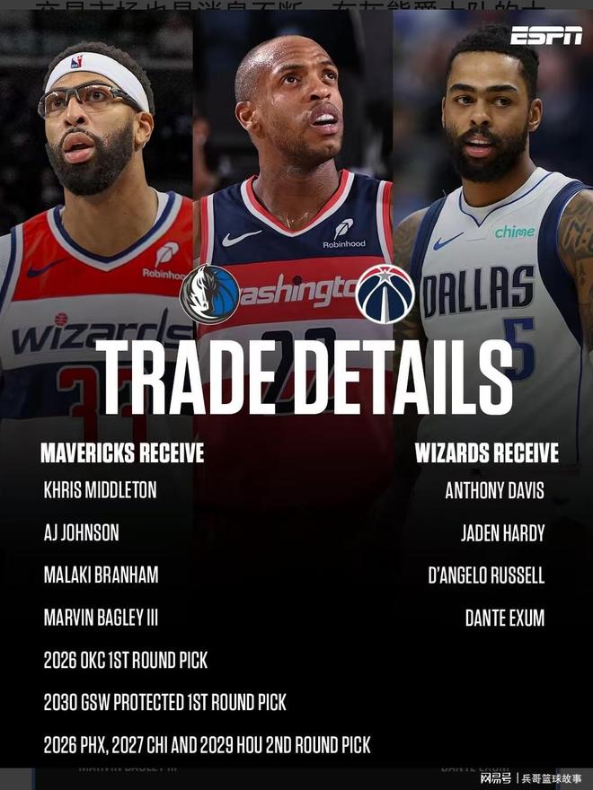 据SHAMS报道,独行侠和奇才进行大交易,独行侠将浓眉、哈迪、拉塞尔和艾克萨姆交易到奇才,换来汉密尔顿、约翰逊、布兰纳姆。巴格利,2个首轮和3个次轮签!