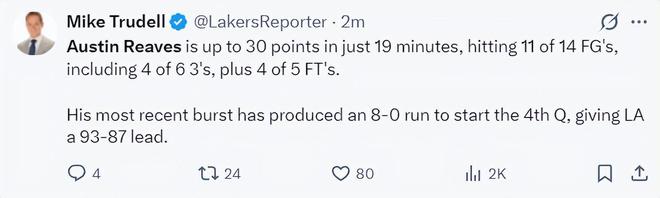 奥斯汀-里夫斯实在是太出色了,末节开场湖人还在落后,但在短短1分06秒的时间里里夫斯一人打出了8-0的攻势直接帮助湖人反超,湖人队记迈克-特鲁戴尔都觉得不可思议。