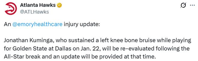北京时间2月8日,亚特兰大老鹰官方今日宣布,球队新援前锋乔纳森-库明加因左膝骨挫伤,将在全明星周末后接受伤情复查。