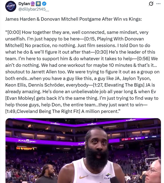 值得一提的是,哈登赛后透露自己仅与骑士队合练了10分钟,其余时间都只是看录像分析。