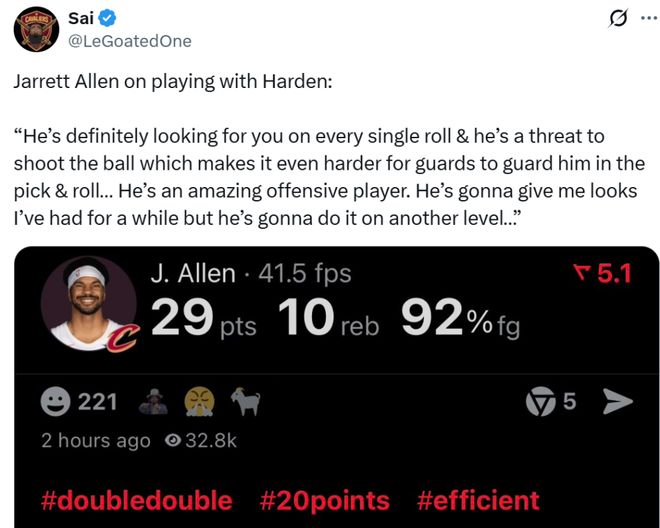 对此赛后哈登表示:“艾伦的表现不可思议,当莫布利回归后也会有相同待遇,我在努力找到帮助这些球员的方法,帮助艾伦、帮助莫布利、帮助米切尔,帮助球队赢得更多胜利。”