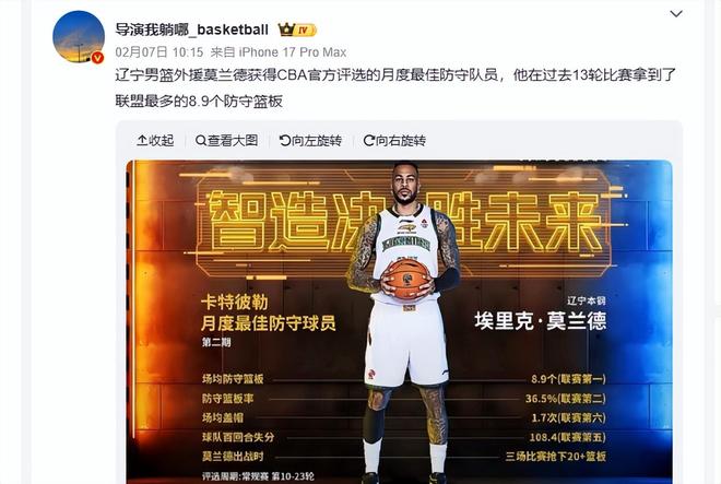 2月7日,CBA官方发布正式官宣,辽宁男篮的内线球员莫兰德,当选为2025-2026赛季CBA联赛第二期月度最佳防守球员。不得不说,我们理应向莫兰德表示祝贺。莫兰德身高两米零八,在内线领域,他的防守意识和防守能力都堪称CBA联盟顶级水准,而且本赛季他始终保持稳定高效的发挥,用实力为球队保驾护航。
