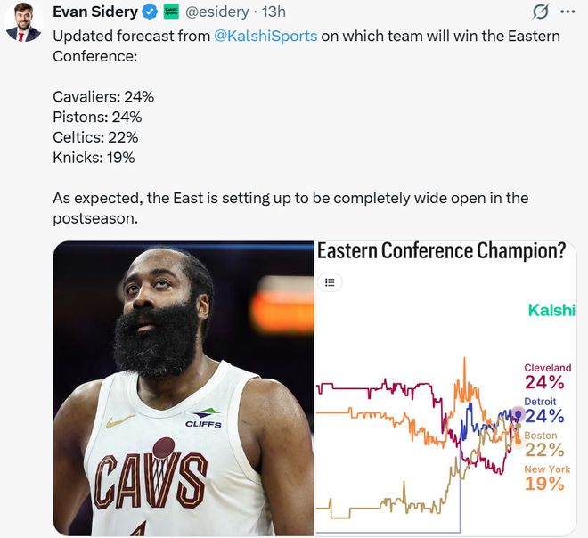 同时骑士队夺得东部冠军的概率也飙升至24%,追平活塞并列东部第一,凯尔特人随之下滑到22%,尼克斯更是一路跌至19%仅排第四。